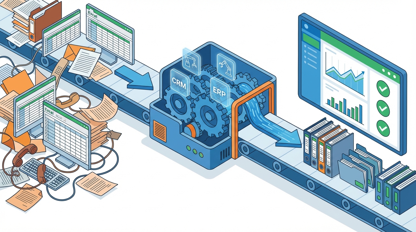 Автоматизация бизнеса — это перевод ручных повторяющихся операций в программные. Вместо того чтобы менеджер вручную заносил данные клиента в таблицу, отправлял письмо и ставил себе напоминание позвонить — это делает CRM-система.