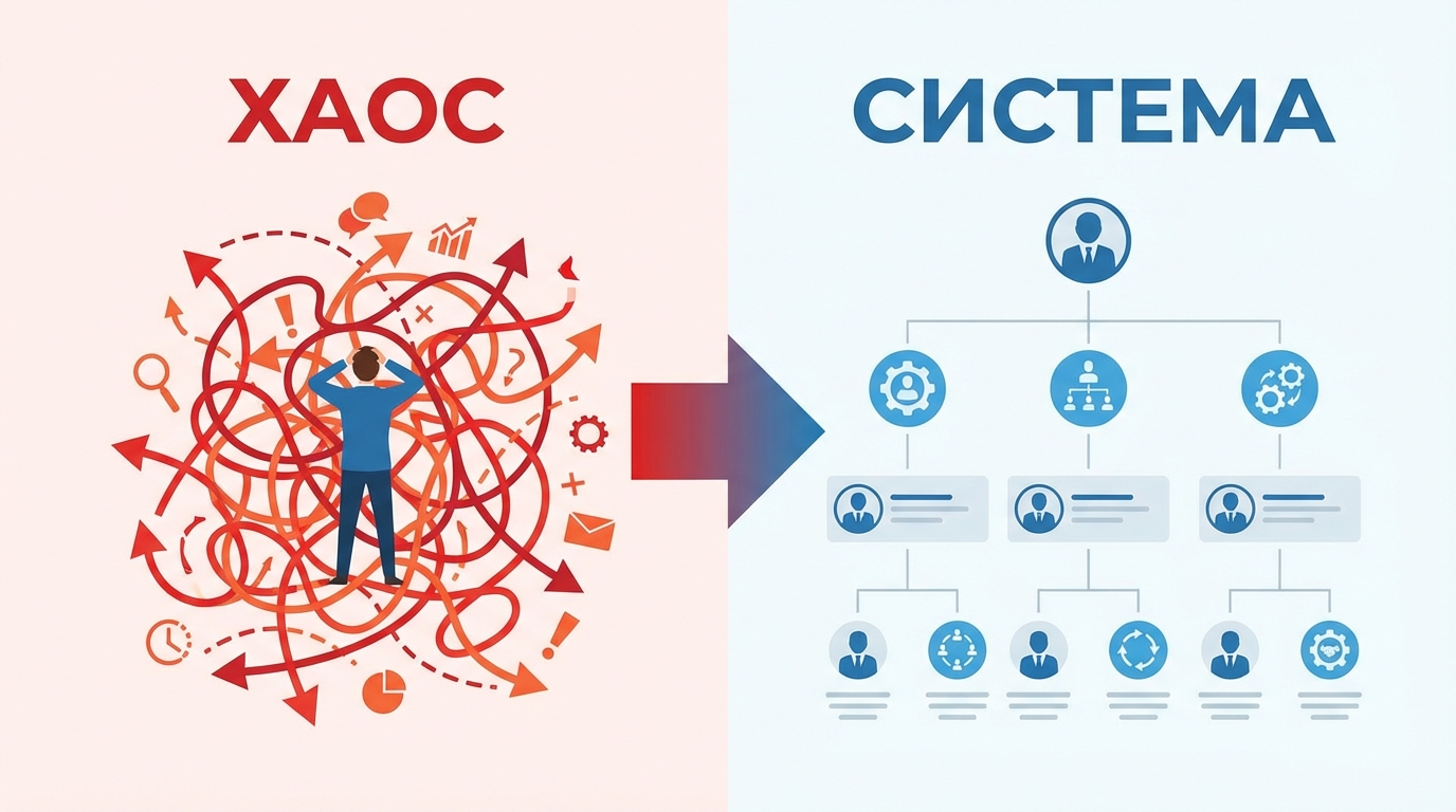 Когда организация выстроена — каждый сотрудник понимает свою зону ответственности. Нет дублирования («а я думал, это Петров делает»), нет пробелов («а это вообще чья задача?»).